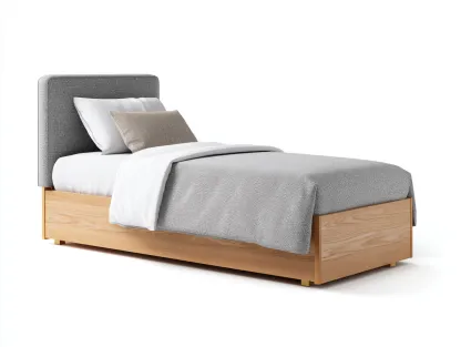 Cama individual de estilo moderno diseñada para ofrecer una solución práctica y estética en dormitorios individuales. La combinación de cabecero tapizado y base en acabado madera aporta equilibrio visual y un ambiente acogedor.