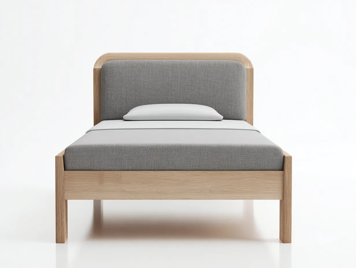 Cama individual de diseño moderno pensada para dormitorios juveniles o espacios individuales. Su estética equilibrada combina líneas rectas con un cabecero tapizado que aporta una sensación acogedora y ordenada al ambiente.