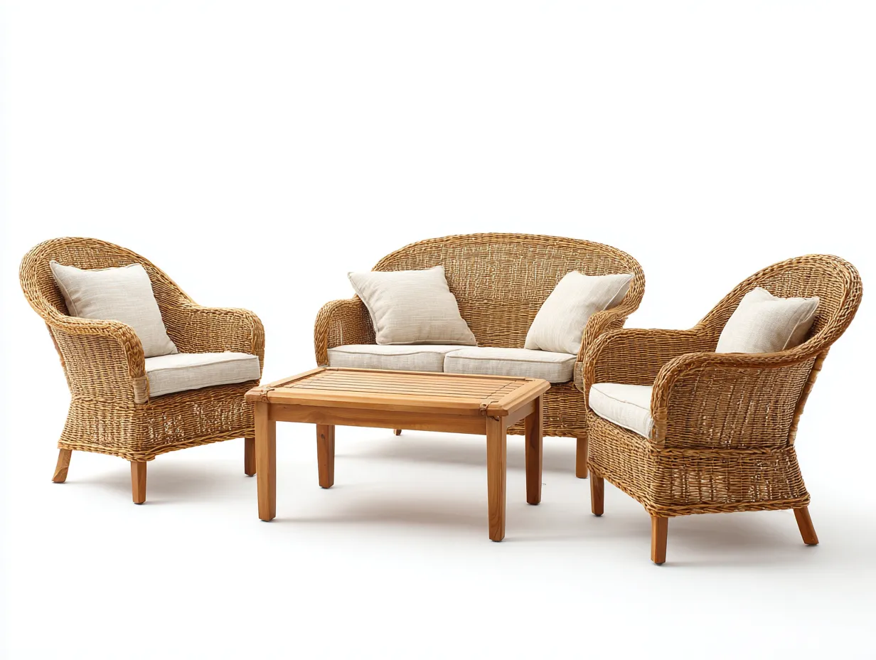 Conjunto de sofás de jardín diseñado para crear una zona de descanso acogedora en espacios exteriores. Su estructura trenzada y sus líneas suaves aportan un aspecto natural y equilibrado a jardines, terrazas o patios.